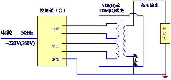把電源輸入有過(guò)流自動(dòng)脫扣及防止突發(fā)加壓的零位連鎖裝置的操作箱,經(jīng)自耦調(diào)壓器調(diào)節(jié)電壓輸入YDQ-J試驗(yàn)變壓器初級(jí)繞組,根據(jù)電磁感應(yīng)原理,在次級(jí)(高壓)繞組按其與初級(jí)繞組匝數(shù)之比可獲得同等倍數(shù)的電壓幅值-工頻高壓。