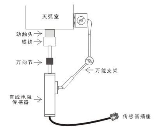 200mm、300mm用于SF6開(kāi)關(guān)行程,速度的測(cè)量,此兩種傳感器為非標(biāo)準(zhǔn)配置。以某型號(hào)真空開(kāi)關(guān)為例,如下圖。直線電阻傳感器在安裝時(shí),要保證傳感器運(yùn)動(dòng)軸能夠直線運(yùn)動(dòng),用磁性萬(wàn)能支架固定好傳感器。對(duì)于SF6開(kāi)關(guān)、油開(kāi)關(guān),方法類似。