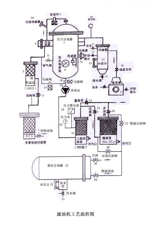 2、當油液經 數次 分離過濾后,從聚結分離罐(3),集水筒旁水位計(32)觀察,由排水閥排水,直到油箱內被過濾的油水分排盡為止,對于要求較高的油可最后采用真空分離法,如下: