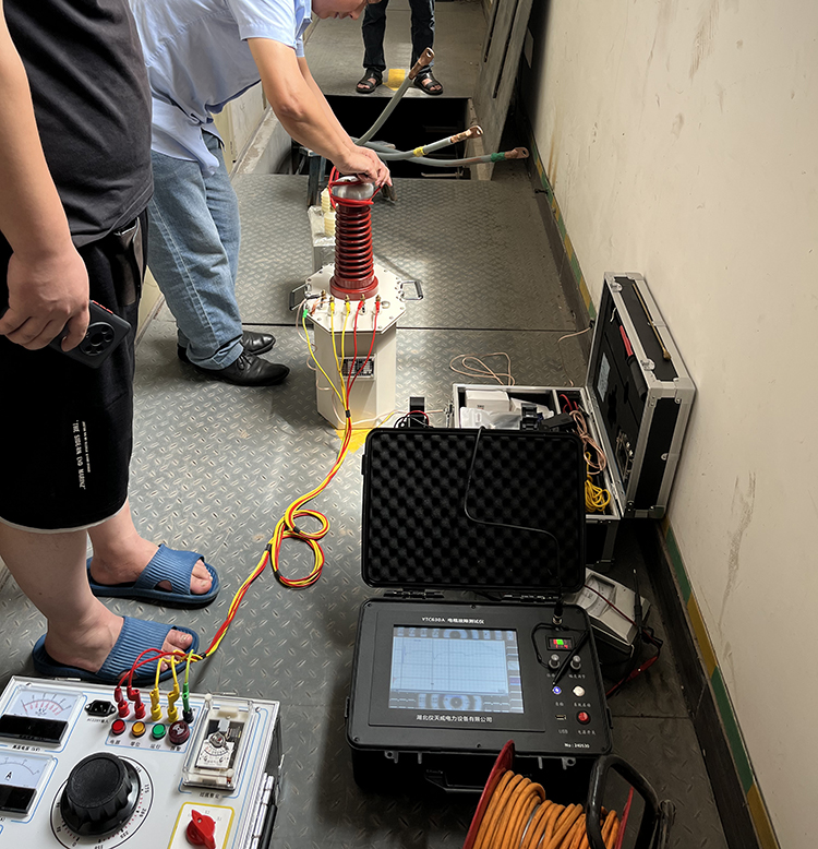 此次客戶那邊遇到的麻煩是電纜在運輸電過程中出現(xiàn)了供不上電情況,客戶那邊先自身對電纜做了基本的檢查,一時間也找不準問題,于是就找到我司去幫忙找出電纜故障問題。我司趕到現(xiàn)場后,先咨詢了客戶相關(guān)的電纜類型的問題,如:電纜是否帶電,是帶鎧電纜還是不帶鎧的等等,摸清電纜的類型等一些相關(guān)信息后,我司技術(shù)人員便開始著手采取相應(yīng)的故障檢測措施了,首先我們做的是默認的“低壓脈沖法”來檢測電纜故障情況,我們先是通過波形采樣,得到一個比較適合分析的波形后,然后對波形進行分析,從波形我們可以知曉電纜的大致長度,以及故障點發(fā)生的大致一個區(qū)間位置,然后對那個故障區(qū)間位置進行更進一步的甄別查找,這樣便很大程度地減輕了工作人員查找故障的工作量,不過這次的電纜故障查找有點特殊,通過“低壓脈沖法”并不能很好地找出故障問題,于是后面又采取了“高壓閃絡(luò)法”進行檢測,高壓閃絡(luò)過程,便需要利用到高壓升壓試驗裝置來對電纜進行升壓,從而來得到更明顯的波形。
