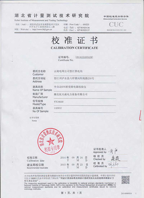 在封閉容器中,一定溫度下的SF6氣體壓力可代表SF6氣體的密度。為了能夠統一,習慣上常把20℃時SF6 氣體壓力作為標度值。在現場校驗時,在不同的環境溫度下,測量的壓力值都要換算成其對應20℃時的壓力值,從而判斷SF6密度繼電器的性能。 YTC4650型智能型SF6密度繼電器校驗儀對這個過程是自動完成的,既準確,又靈活方便。本儀器除可對SF6密度繼電器校驗外,還具有對壓力表、密度表進行校驗和儀器自校的功能,這樣不僅可以一機多用,還免除了儀器送檢和返廠校驗的難題。