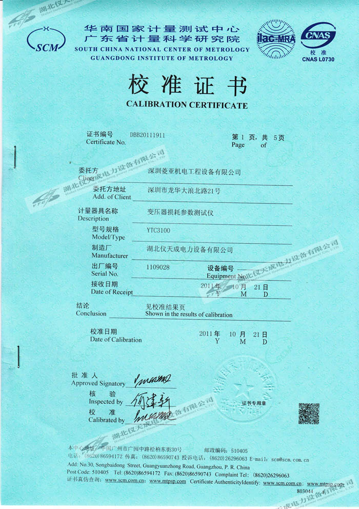 YTC3100變壓器損耗參數(shù)測試儀的資質(zhì)證書