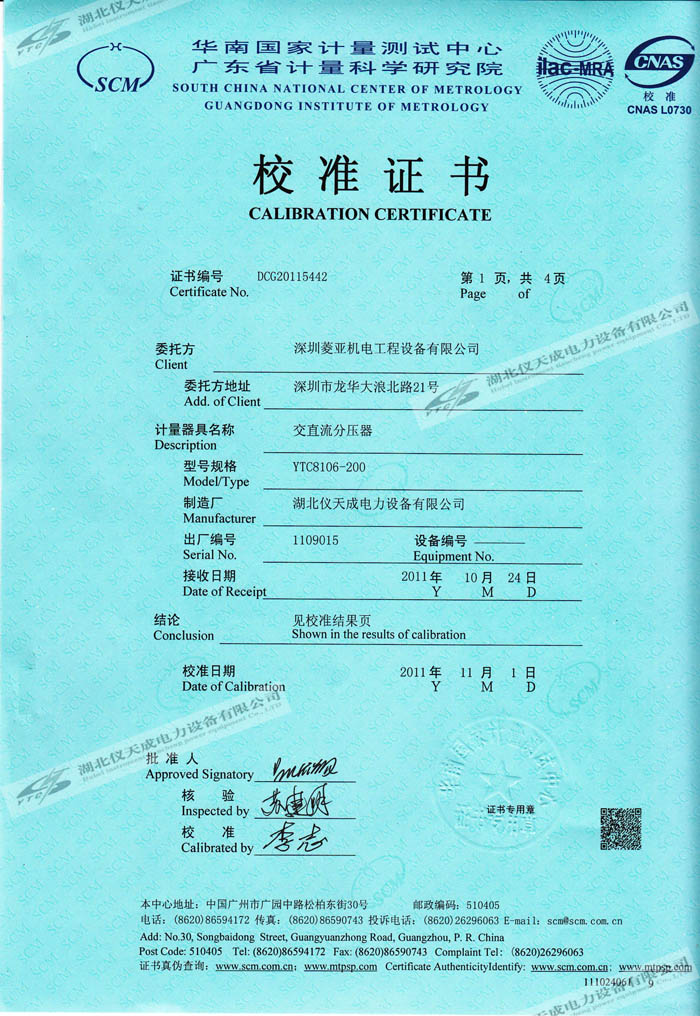 轉(zhuǎn)載:"YTC8106-200 交直流分壓器的資質(zhì)證書" 請注明來源于儀天成電力。 更多技術(shù)問題請致電儀天成電力客戶服務(wù):027-87876585,技術(shù)部專線:027-87876585,在線客服:719388481