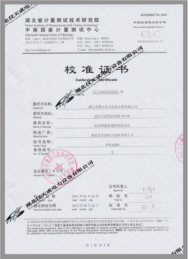 氧化鋅避雷器特性測(cè)試儀鑒定證書